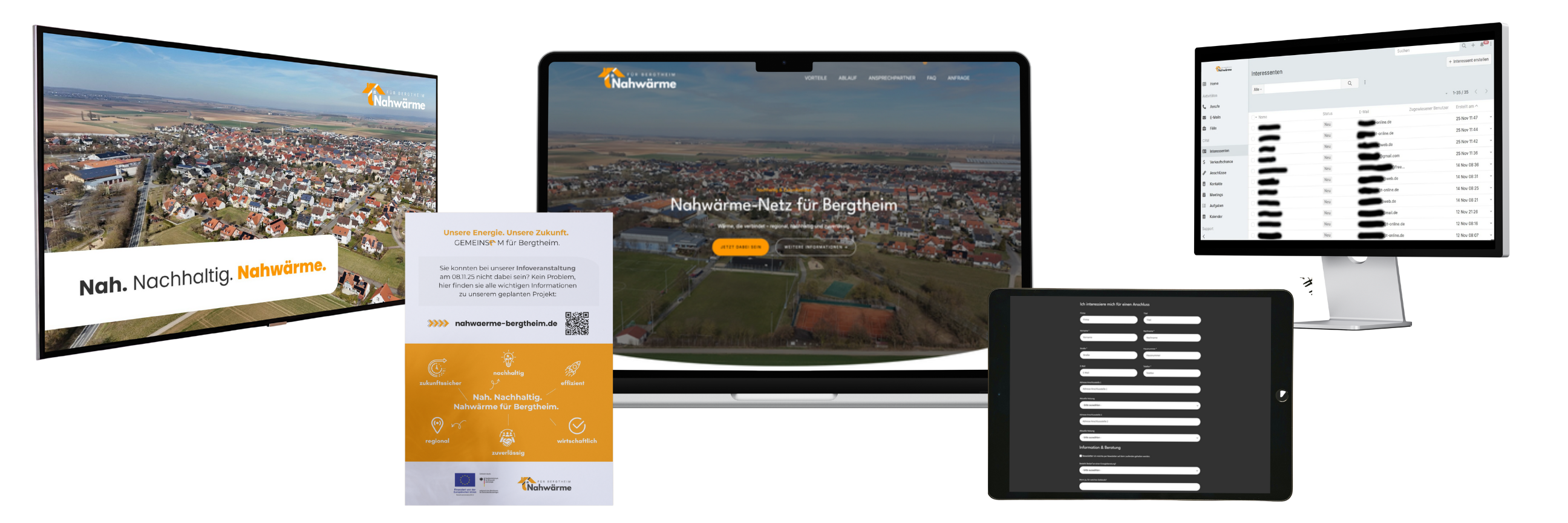 Für die Nahwärme Bergtheim haben wir deshalb ein Gesamtpaket entwickelt, das die Kommunikation mit potentiellen Kunden ungemein erleichtert: Website, CRM, Online-Formulare, Infoveranstaltungen, Präsentationen, Banner und Infomaterial – alles aus einem Guss.